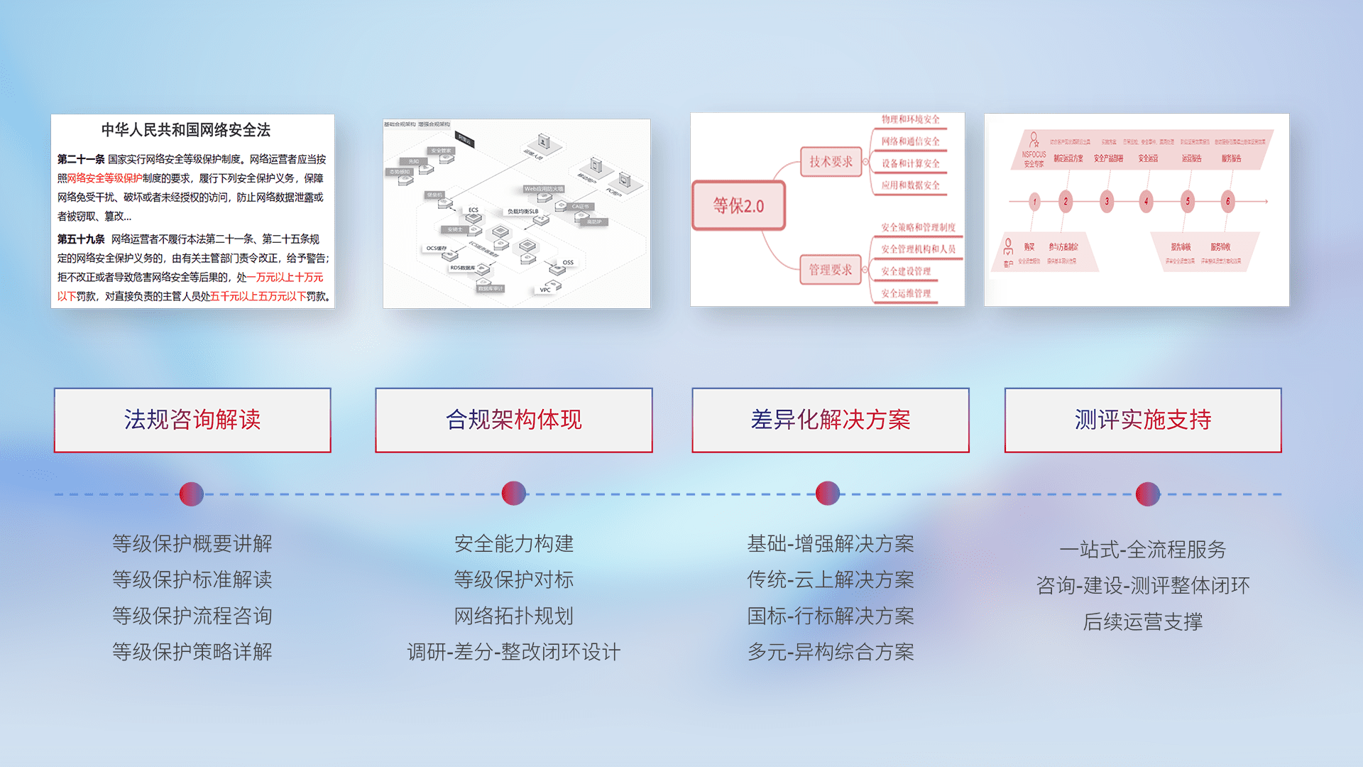 通过专业的法律咨询解读、、合规架构体现、、、、差异化解决方案、、、、测试实施支持等服务,,,,为客户量身打造等保合规体系。。。
